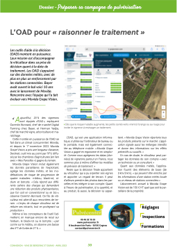 L’OAD, qui est une application informa- tique, s’utilise sur l’ordinateur de bureau ou le portable, mais est également connec- tée au téléphone mobile. « Movida Grape Vision a gagné en ergonomie et en simplici- té. Comme nous agrégeons les datas (don- nées) de vignerons partout en France, nous sommes plus à même d’affiner les modèles de prévision de traitement. »